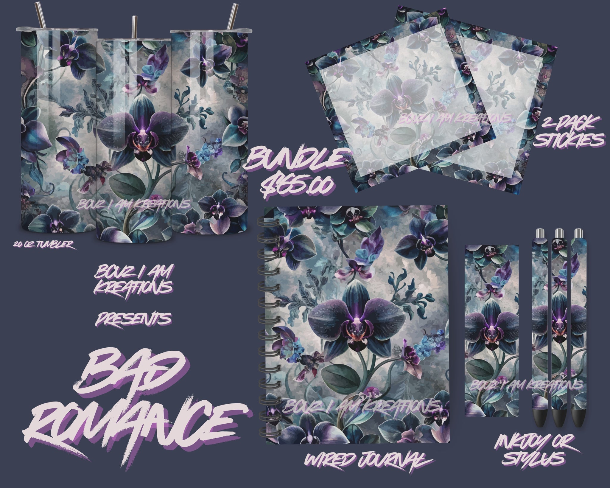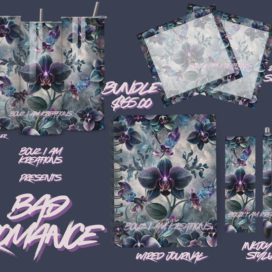 Curated for orchid enthusiasts, the Bad Romance Bundle combines essential everyday items into one cohesive collection. This thoughtfully assembled set includes a 20 oz tumbler perfect for your favorite beverages, a 2-pack of post-its for quick notes, your choice of either an InkJoy gel pen or stylus for seamless writing and digital interaction, and a wired journal for capturing ideas. Each component is selected to complement the others, creating a functional bundle designed for those who appreciate both style and practicality. Available exclusively as a complete bundle.